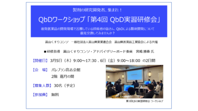 今年度も、富山くすりコンソでは、富山県薬業連合会、富山県医薬品工業協会との共催で医薬品の製剤開発力の向上と実務担当の人材育成を目的に、QbDワークショップ「第4回 QbD実習研修会」を開催します。ご応募を心からお待ちして … 続きを読む 【参加者募集】QbDワークショップ「第4回 QbD実習研修会」開催のお知らせ