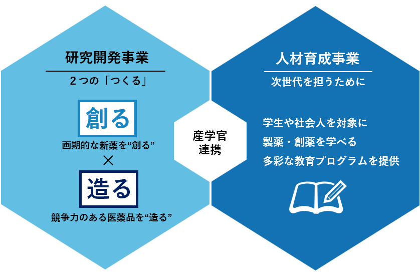 研究開発事業では、「創薬」と「製薬」という2つの「つくる」にフォーカスした研究テーマを推進、