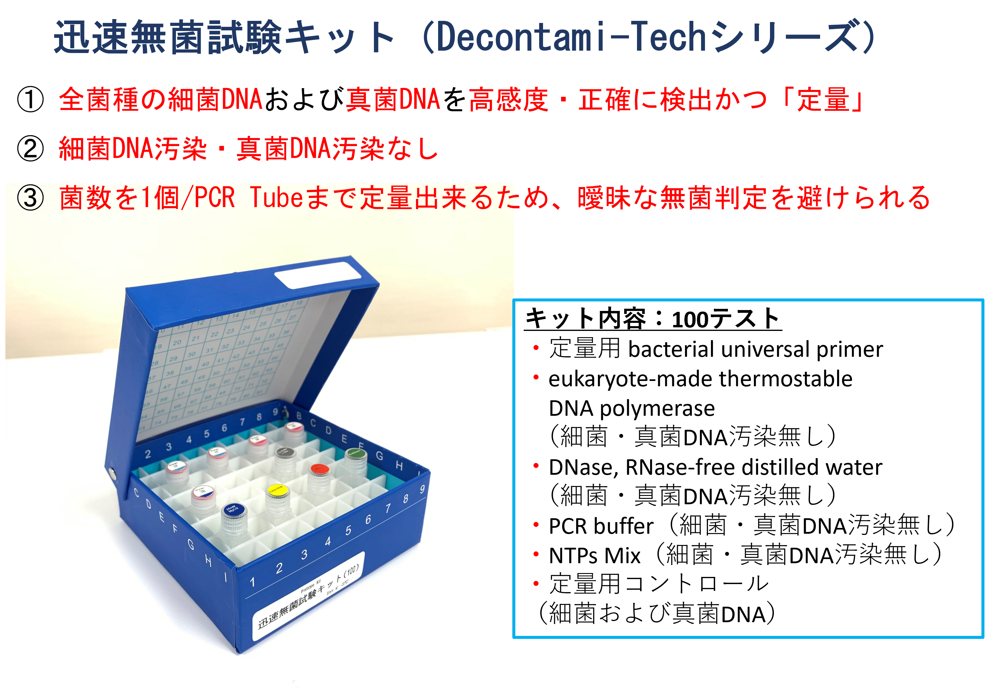 私たちは、真核生物にTaq DNA polymeraseを作らせる独自技術を確立し、PCR検査における課題であった細菌DNA汚染を根本から解決しました。この技術により、微量な微生物も高感度に検出できるPCRを用いた無菌検査を可能にしています。